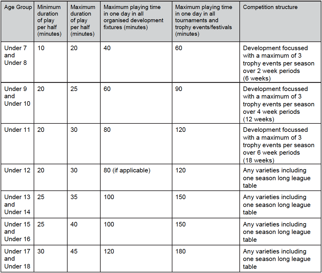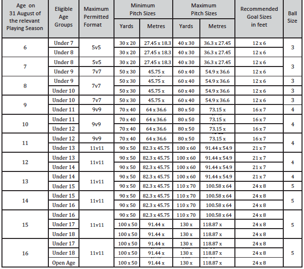A child who has not attained the age of 6 shall not play, and shall not be permitted or encouraged to play, in a match of any kind. The relevant age for each Player is determined by his or her age as at midnight on 31 August of the relevant Playing Season i.e. children who are aged 6 as at midnight on 31 August in a Playing Season (together with those who attain the age of 6 during the Playing Season) will be classed as Under 7 Players for that Playing Season.